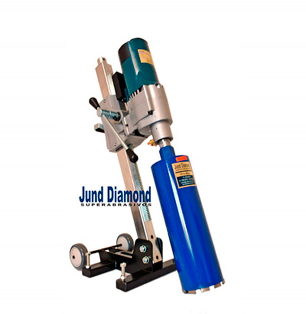 Eixo do Motor: 11/4” Rosca Macho (Padrão Universal) | Equipada com um suporte de pega que facilita muito o Transporte | Equipada com Base Pequena, ideal para perfurações em vigas e rodinhas que torna pratico sua locomoção | Além do sistema tradicional da fixação através da fenda da Base. É também equipada também com um dispositivo no topo da coluna que possibilita e facilita muito a fixação em operações sob tetos com fixação por pressão com hastes. | Equipada com Entrada de Agua para Refrigeração da broca |